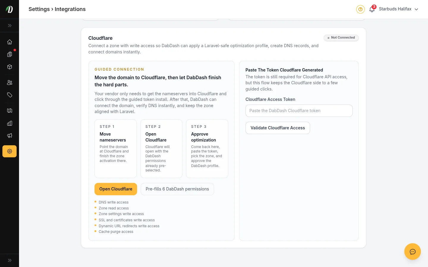 - Haz clic en Validar acceso de Cloudflare. DabDash confirma que el token es válido y carga tus zonas.