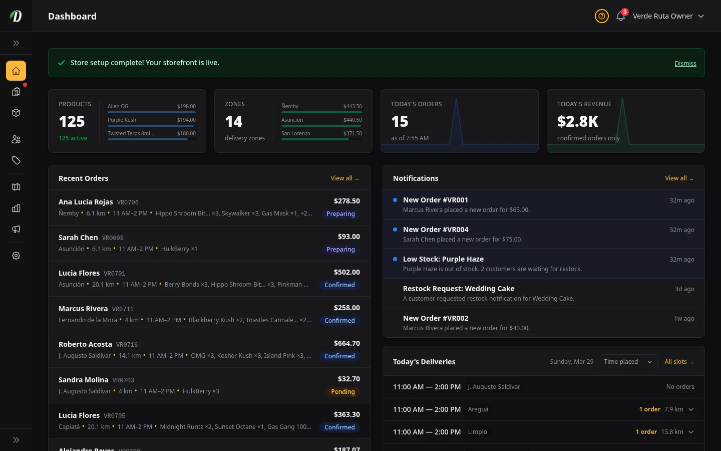 En el momento en que inicias sesión, ves exactamente dónde está tu negocio. Número de productos, zonas de reparto activas, pedidos del día e ingresos — todo en una sola pantalla. Las alertas de stock bajo detectan los problemas antes de que cuesten ventas.